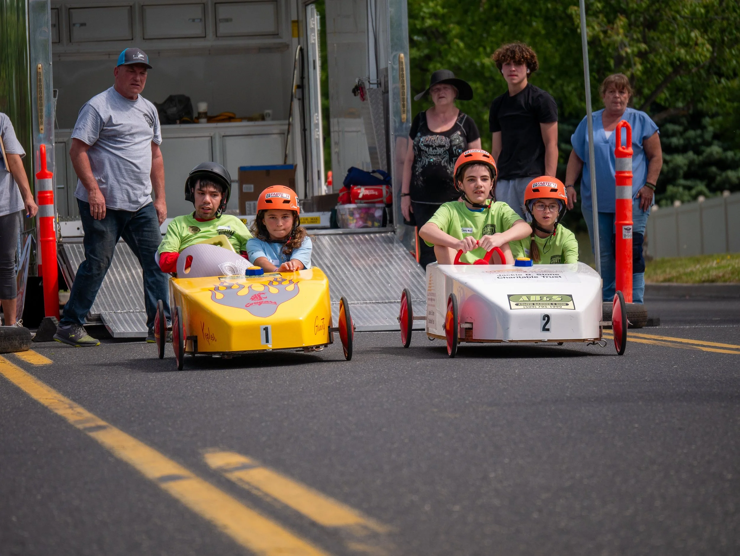 The cars in this race fit two children; one Driver and one passenger (Racer). The cars have a steering wheel and a brake that only the Driver can control. The Racer often has a mock steering wheel with no connection to the steering and/or control of the car.